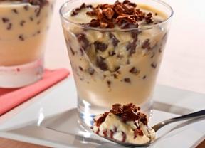 No liquidificador, bata o leite condensado, o creme de leite, o sorvete e a gelatina reservada. Em um refratário ou em taças individuais, alterne camadas de creme e camadas de chocolate picado.